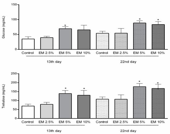 Concentrations of glucose and trehalose in honey bee hemolymph sampled on the 13th and 22nd day of the experiment in laboratory-controlled conditions for control and experimental groups (EM 2.5%, EM 5%, EM 10%). Asterisks indicate statistically significant differences, Control vs. EM 5% and EM 10%; * p < 0.001; mean ± SD.