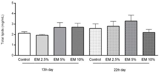 Total lipids concentration in honey bee hemolymph sampled on the 13th and 22nd day of the experiment in laboratory-controlled conditions, for control and experimental groups (EM 2.5%, EM 5%, EM 10%). No significant differences between control and experimental groups were found.