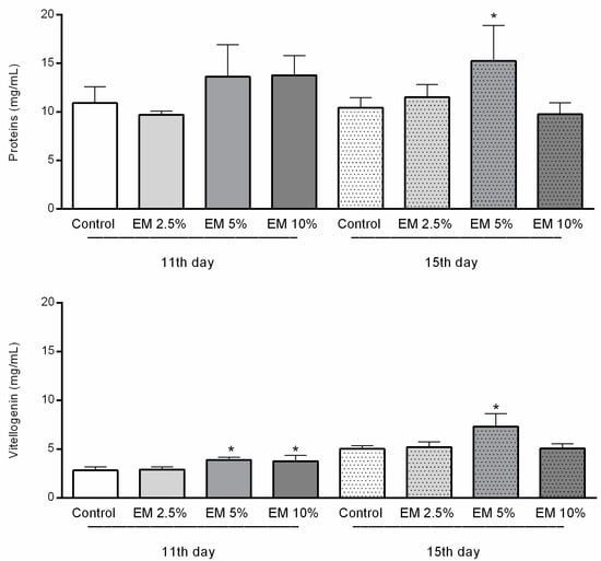 Total proteins and vitellogenin concentrations in honey bee hemolymph sampled on the 11th and 15th day of trail in laboratory-controlled conditions, for control and experimental groups (EM 2.5%, EM 5%, EM 10%). Asterisks indicate statistically significant differences, Control vs. EM 5% and EM 10% on the first and EM 5% on both observed dates, * p < 0.01; mean ± SD.