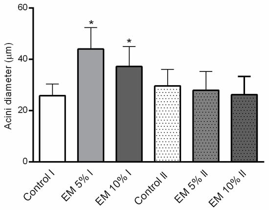 Hypopharyngeal glands acini diameter (µm), dissected from the 11 (I) and 15 (II) days old adult honey bees, during trials in laboratory-controlled conditions, for control (Control) and experimental groups (EM 5%, EM 10%). Asterisks indicate statistically significant differences comparing the mean acini diameters between diets per group and represent a * p < 0.0001 level of significance; mean ± SD.