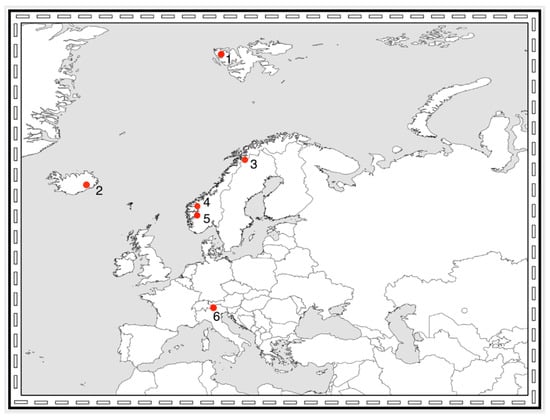 European glacial areas mentioned in this review. 1: Midtre Lovén-bre, Svalbard. 2: Vatnajökull, Iceland. 3: Ålmajallojekna glacier, Sweden. 4: Jostedalen and Jotunheimen, Norway. 5: Hardangerjøkulen, Norway. 6: Closely situated glaciers in the Alps (Italy and Austria).