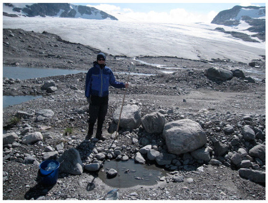 - Hågvar, S.; Ohlson, M.; Brittain, J.E. A melting glacier feeds aquatic and terrestrial invertebrates with ancient carbon and supports early succession. Arct. Antarct. Alp. Res. 2016, 48, 551–562. [Google Scholar] [CrossRef]