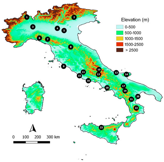The Italian peninsula is located in the center of the Mediterranean Basin, one of the world’s hotspots of biodiversity [8,17,18], showing exceptionally high levels of diversity for a variety of plant and animal taxa [19,20]. At the same time, due to the profound, millenary impacts on the wilderness of this area, the Mediterranean biodiversity has been strongly influenced by the human presence, and it is currently under many threats [21,22].