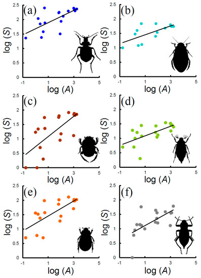 Species–area relationships (SARs) for various beetle groups in Italian reserves: (a) Carabidae, (b) Hydradephaga, (c) coprophagous Scarabaeoidea, (d) phytophagous Scarabaeoidea, (e) total Scarabaeoidea, (f) Tenebrionidae. Decimal logarithms are used.