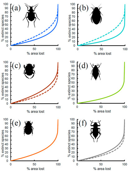 Extinction rates (% of extinct species) expected on the basis of area loss (% of area lost) for various beetle groups in Italian reserves: (a) Carabidae, (b) Hydradephaga, (c) coprophagous Scarabaeoidea, (d) phytophagous Scarabaeoidea, (e) total Scarabaeoidea, (f) Tenebrionidae. Solid lines: expected rates from the species–area relationship. Dashed lines: expected rates from multiple regression models.