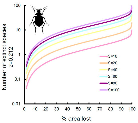 Number of extinct species expected on the basis of area loss (% of area lost) for the Carabidae of Italian reserves for areas hypothetically hosting 10, 20, 40, 60, 80, and 100 species. Curves were calculated using z = 0.212, as obtained from the power function of the species–area relationship. Use of z-values from multiple models did not change the pattern. Note the log-scale for the y-axis.