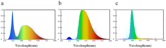 The spectra of the light emitting diode (LED) lights. (a) white LED lights; (b) green LED lights; (c) yellow LED lights.