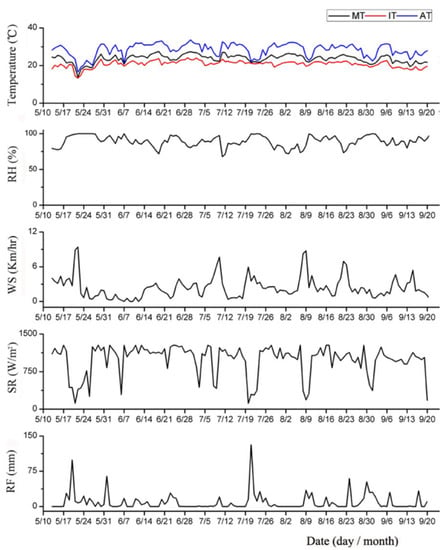 During the study, a weather station (HOBO ware, Bourne, MA, USA) was set near the testing field to record the weather parameters including rainfall (RF), relative humidity (RH), solar radiation (SR), wind speed (WS), and temperature. To accurately match the trapping periods (which were recorded every day at 7:00 a.m.), daily weather data were collected from 7:00 to 6:59 a.m. the following day (Figure 3).