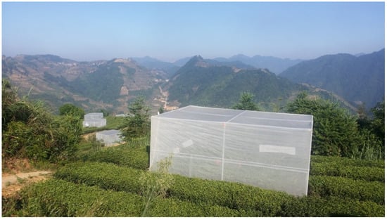 To assess the control effects of yellow sticky cards and light traps, 25 exclosure cages (3 × 4.5 m, and 2 m in height; Figure 4) were installed in another large section of the tea plantation, where two rows of tea plants were surrounded by each exclosure. To reduce interaction, the exclosures were set 10 m apart. The frame of the cage was made of aluminum alloy, covered with white nylon net (100 mesh). The cages served to isolate tea plants so that each cage represented an independent small ‘ecosystem’, still sharing the same environmental conditions with the other cages. According to the preliminary measurements, except for the wind speed that was reduced by 50%, the conditions such as temperature, rainfall, relative humidity, and solar radiation inside the cages were not significantly different from outside the exclosures.