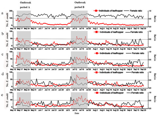 Population dynamics and female ratios of Empoasca onukii trapped/collected in the five treatments during the course of field experiment (13 May to 20 September 2015). (a) suction machine; (b) yellow sticky card; (c) white light trap; (d) green light trap; (e) yellow light trap. The outbreak period A and outbreak period B were covered with gray shades.