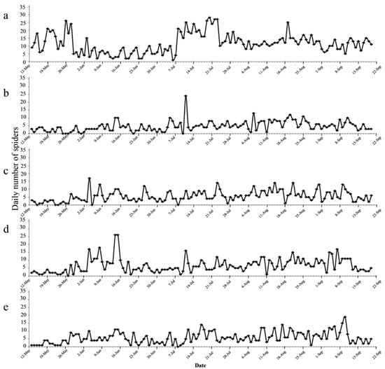 The spiders caught by the suction machine and four different trapping techniques were mainly from the families Araneidae, Oxyopidae, Salticidae, Theridiidae, and Micryphantidae. Among the four trapping treatments, we observed that yellow sticky card trapped the least number of spiders (124 ± 18), though there was no significant difference compared to the others (Table 1). Two outbreak periods (14–28 May and 8–23 July) of spider populations were observed when looking at daily numbers collected by the suction machine (Figure 6a), which corresponded to the population peaks in tea green leafhopper. The four trapping treatments, however, did not show a similar trend (Figure 6b–e).