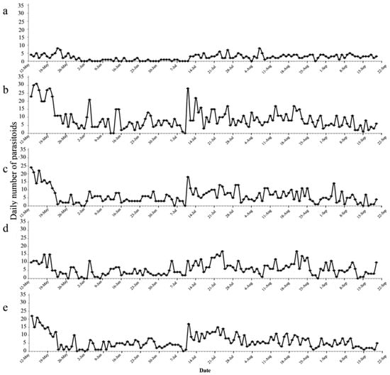 Numbers of parasitoids trapped/collected in the five treatments during the course of field experiment (13 May to 20 September 2015). (a) suction machine; (b) yellow sticky trap; (c) white light trap; (d) green light trap; (e) yellow light trap.