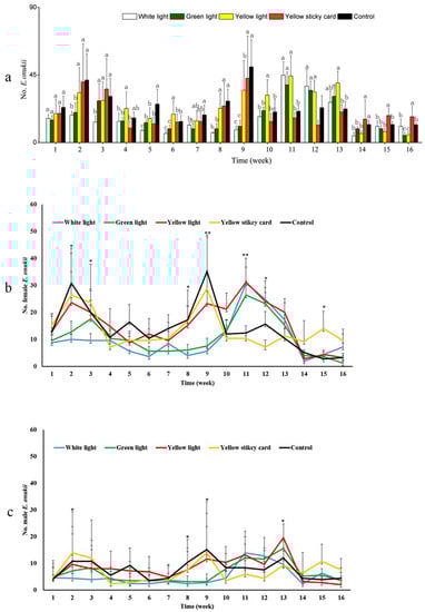 Population dynamics of total E. onukii (a), female (b) and male (c) in the five treatments in the exclosure experiment. Different letters within the same week represent significant differences based on a one-way ANOVA followed by an LSD test, p < 0.05; Significant differences based on a one-way ANOVA followed by LSD tests, *: p < 0.05; **: p < 0.001. The weekly collection lasted from 25 August to 8 December, for a total of 16 weeks.