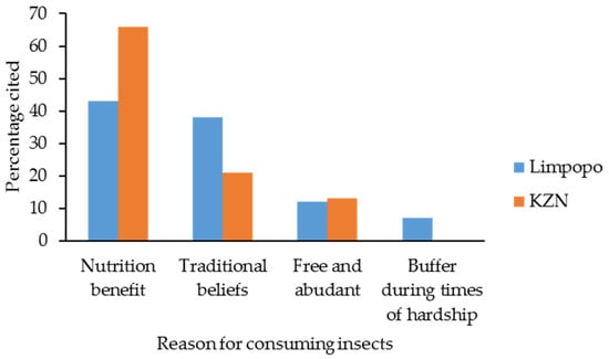 46]. The current study reported a greater number of respondents consuming insects in their lifetime in Limpopo (98%) and KwaZulu-Natal (64%). These results are similar to those of Shackleton et al. [