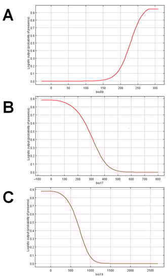 Response (probability of presence) of Comperiella calauanica to selected bioclimatic variables: (A) mean temperature of the driest quarter; (B) precipitation of the driest quarter; and (C) precipitation of the coldest quarter.