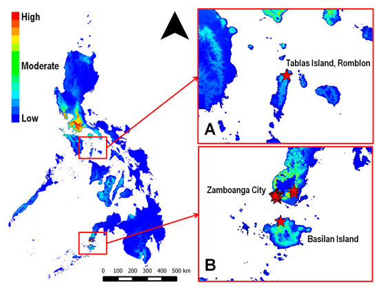 Maxent SDM of Comperiella calauanica, with areas in Romblon (A) and Western Mindanao (B) where infestations of Aspidiotus rigidus had been confirmed. Red stars mark the points where confirmatory surveys were conducted between November 2016 and January 2017.