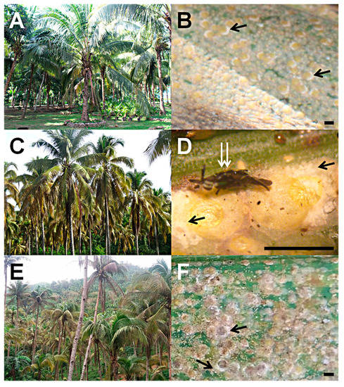 Aspidiotus rigidus-infested coconut trees with magnified view of scale colony samples from: Zamboanga City (A,B); Isabela City, Basilan (C,D); and Tablas Island, Romblon (E,F). Black arrows point to the characteristic distribution of eggs and egg skins along the pygidial ends of mature female A. rigidus which can be used as basis to quickly distinguish this species from other Aspidiotus spp. on coconut. White double arrow points to female Comperiella calauanica. Scale bars on the photomicrographs approximate 1.0 mm.