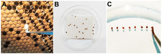 Bioassays with Varroa destructor. (A) Parasitized bee pupae extracted from the brood cells. (B) Female mites laid on top of the acaricide strip inside a Petri dish. (C) Mortality was evaluated by assessing the movement of mites after probing them with a fine paint brush.