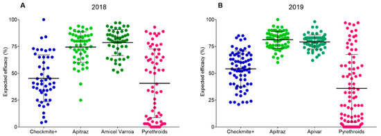 Expected efficacy of commercial acaricides against Varroa destructor in the 2018 season (A) and 2019 season (B). Each dot corresponds to the sample from an apiary. Long horizontal bars represent the mean values and error bars indicate the standard deviation (SD). For Checkmite+, Apitraz, Amicel, and Apivar, the expected efficacy corresponds to mortality recorded in the bioassays. The expected efficacy of pyrethroids-based acaricides was estimated using the frequency of pyrethroid-resistant (RR) and susceptible mites (SS + SR) after genotyping individual mites for the presence of different alleles of the mutation L925V at the V. destructor VGSC.