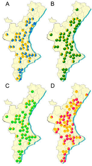 Despite the treatments to manage the mite, Varroa parasitism is far from being controlled, and it is a persistent problem in all honey-producing countries [1,26]. It seems plausible that the continuous presence of varroosis in beehives around the world is related to the resistance to acaricidal products. In Spain, this correlation has not been confirmed yet since there is no program to track the efficacy of the treatments or the evolution of resistance in Spanish apiaries. The lack of knowledge of the incidence and prevalence of varroosis in all the territories of this country led us to plan a systematic study in the Comunitat Valenciana region. The goal of this study is to determine the efficacy of the three groups of hard acaricides in V. destructor populations from apiaries located throughout the three provinces of the region. This study is coordinated with the Department of Agriculture, Environment, Climate Change and Rural Development of the regional government (Generalitat Valenciana, www.gva.es) and Sanitary Defense Groups (abbreviated as ADS in Spanish) of the beekeeping sector. Our aim is to provide beekeepers with information about the impact of varroosis in their colonies and to estimate the expected efficacy for each apiary of acaricide treatments based on pyrethroids, coumaphos, and amitraz.