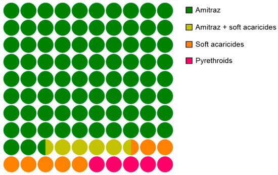 Along with the brood combs, information about treatment history was collected from each apiary. These data show that most of the beekeeping operations used amitraz-based acaricides (88% of the treatments), while the use of other treatment regimens, such as those based on pyrethroids and soft acaricides, was much lower, representing 5% and 7% of the total treatments, respectively (Figure 5).