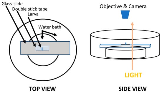 The heart rates were recorded by video camera and counted by direct visual observation of the recordings. The heart rates obtained for intact larvae were performed by drying the larvae with tissue paper and then placing them on double-stick tape, which was placed on a microscope slide (Figure 1A, also shown as a movie, see Reference [33]). The intact larvae moved a lot and would wiggle at higher temperatures. Bright light was needed to shine through the body as it was easier to see the heart tube and count the heart rate. For this approach, we used light reflected off a mirror and transmitted through the base of the microscope, and the water bath. The light penetrated the slide with the larvae attached to the double-stick tape (Figure 2).