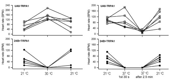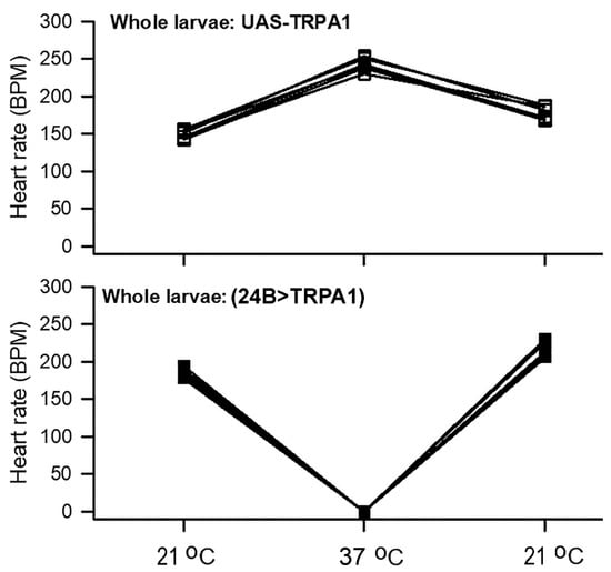 The following are available online at https://www.mdpi.com/2075-4450/12/1/38/s1, Figure S1: The heart rate for intact larvae. The heart rate increased in UAS-TrpA1-RNAi#1 and in 24B>TrpA1-RNAi#1 from 21 to at 37 °C (p < 0.05, Paired t-test). There is no significant difference from the background to the RNAi strain. Figure S2: The heart rate for the dissected background strain and TrpA1-RNAi expressed in all mesoderm. The heart rates increased in UAS-TrpA1-RNAi#1 from 21 to at 30 °C (p < 0.05, Paired t-test). The same strain showed variation upon exposure at 37 °C, with some larvae increasing in rate and others decreasing. After 2.5 min, the rates also continued to show variation with some preparations increased rates while other decreased. There is no significant difference from the background to the RNAi larvae. These animals were all raised at 21 °C. Figure S3: The heart rate for the dissected background and expression of TrpA1-RNAi in mesoderm for larvae raised at 21 °C and 27 °C for exposure to 30 °C. The heart rate increased in UAS-TrpA1-RNAi#1 and 24B>TrpA1-RNAi#1 from 21 °C to at 30 °C for larvae raised at 21 °C and 27 °C (p < 0.05, Paired t-test). The UAS-TrpA1-RNAi#2, 24>TrpA1-RNAi#2, UAS-GFP and 24B>GFP strain showed a lot of variation upon exposure 30 °C for being raised at 21 °C or 27 °C. There is no significant difference from background strains compared to the ones crossed to the 24B strain. Figure S4: The heart rate for the dissected background and expression of TrpA1-RNAi in mesoderm for larvae raised at 21 °C and 27 °C for exposure to 37°C. The heart rate showed a lot of variation upon the initial exposure to 37 °C for most of the strains; however, after two and half minutes the rates generally decreased for all the strains. The UAS-TrpA1-RNAi#2, 24>TrpA1-RNAi#2, UAS-GFP and 24B>GFP strains showed a lot of variation upon exposure 37 °C for being raised at 21 °C or 27 °C. There is no significant difference from background strains compared to the ones crossed to the 24B strain. Figure S5: The heart rate for the dissected strains expressing TRPA-RNAi in heart specific tissue. The heart rate increased in Hand4.2>TrpA1-RNA#1 (A1, A2) and Tinc>TrpA1-RNAi#1 (B1, B2) from 21 °C to at 30 °C (p < 0.05, Paired t-test) for both conditions of larvae raised at 21 °C (A1,B1) as well as at 27 °C (A2,B2). The stains Hand4.2>TrpA1-RNAi#1 (A3, A4) and Tinc>TrpA1-RNAi#1 (B3, B4) upon initial exposure at 37 °C showed quite a bit of variation. However, at 37 °C after 2 and half minutes all rapidly decreased heart rate. The same trends were present for the larvae raised at 21 °C (A3,B3) as well as at 27 °C (A4,B4). There is no significant difference from background strains compared to the ones crossed to the heart specific strains. Figure S6: Controls for the expression of the RNAi strains crossed with the W118 strain for dissected preparations. The UAS-TrpA1-RNA#1/+ showed similar trends as UAS-TrpA1 in an increase in heart rate at 30 °C. The 24B>TrpA1-RNAi#1 as well as the backgrounds and controls (UAS-TrpA1-RNAi#1, UAS-TrpA1-RNAi#2, UAS-GFP, and 24B>GFP) all showed variation upon initial exposure to 37 °C and showed a decrease after two and half minutes at 37 °C. No significant difference occurred among the strains.
