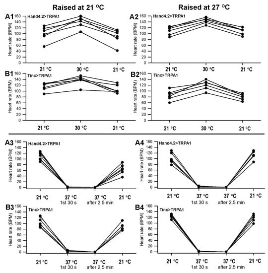 The heart rate for the dissected larvae over-expressing TrpA1 specifically in the heart. The heart rate increased in Hand4.2>TrpA1 (A1,A2) and Tinc>TrpA1 (B1,B2) from 21 to 30 °C (p < 0.05, paired t-test) for both conditions of larvae raised at 21 °C (A1,B1) as well as at 27 °C (A2,B2). The strains Hand4.2>TrpA1 (A3,A4) and Tinc>TrpA1 (B3,B4) upon exposure at 37 °C all rapidly decreased heart rate and maintained a low rate for 2.5 min. Upon exposure to 21 °C, the rates increased. The same trend was present for the larvae raised at 21 °C (A3,B3) as well as at 27 °C (A4,B4). Controls for these strains are illustrated in Figure 4 top panels under the same conditions.