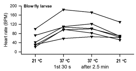 Since it is established that survival of D. melanogaster drastically decreases with temperatures ranging higher than 35 °C [29], while larvae of the medicinal blowfly (Lucilia sericata (syn Phaenicia sericata), Meigen, 1826, Diptera: Calliphoridae) thrive well at temperatures as high as 40 °C, the influence of temperature on the heartbeat of larval (L. sericata) was also examined for a comparison. It would be expected that the heartbeat of the L. sericata larvae would maintain functionality since the larvae grow and thrive at relatively high temperatures; however, it is possible that the larval crawling movements may be sufficient to circulate the hemolymph in the open circulation of the larvae if the heart did not function. The effects of temperature on physiological function of L. sericata is also of therapeutic importance as the larvae are used in wound therapy in humans as well as veterinary care, where environmental temperature varies [30,31].