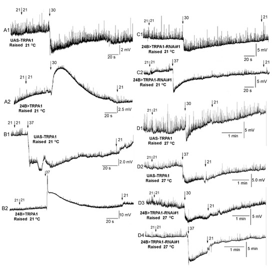 Membrane potential of body wall muscles in TrpA1 overexpressing and RNAi larvae at 30 and 37 °C. The background line of UAS-TrpA1 at 30 °C (A1) and 37 °C (B1) showed hyperpolarization. The 24B>TrpA1 expressing line at 30 °C (A2) and 37 °C (B2) showed transient depolarization. In accordance with the background UAS-TrpA1, the UAS-TrpA1-RNAi#1 at 30 °C (C1) and 37 °C (C2) showed transient hyperpolarization. The lines raised at 21 or 27 °C (D1–D4) had similar responses. By switching the saline bath from 21 to 21 °C, we controlled for mechanical disturbance of changing the bathing media. Arrows indicate where the saline bath was exchanged. N = 6 for each line for each temperature and the trends were consistent with hyperpolarization (UAS-TRPA as well as UAS-TrpA1-RNAi#1, Sign test, p < 0.05) or depolarization (24B>TrpA1, p < 0.05, Sign test).