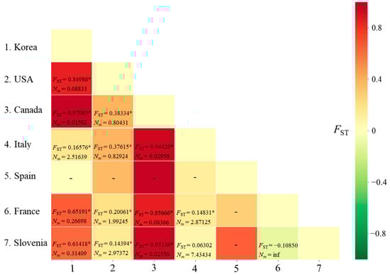 The FST between pairs of countries ranged from −0.10850 (between France and Slovenia) to 0.97085 (between Korea and Canada), with a range of Nm from infinite (between France and Slovenia) to 0.01502 (between Korea and Canada) (Figure 1). A non-significant genetic differentiation at the level of p < 0.05 was observed only in the comparisons between Italy and Slovenia and between France and Slovenia.