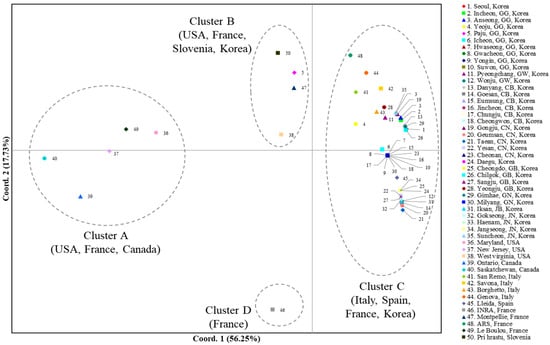 A PCoA using the worldwide COI data to scrutinize population relationships showed that the first and second components accounted for 56.25% and 17.73%, respectively, of the variation (Figure 2). Overall, four clusters (Clusters A, B, C, and D) that could be differentiated based on the two components were detected, although one cluster that stood alone for one French population (Cluster D) was differentiated only by the second component. Cluster A comprised two populations each from Canada (localities 39 and 40, Ontario and Saskatchewan, respectively) and the USA (localities 36 and 37, Maryland and New Jersey, respectively) and one from France, suggesting that one population in France is genetically close to a few North American populations. Cluster B comprised one population each from Slovenia (locality 50, Pri Hrastu), Korea (locality 5, Paju), France (locality 47, Montpellier), and the USA (locality 38, West Virginia), indicating a mixture of the populations from the USA, European countries (Slovenia and France), and Korea. Finally, Cluster C comprised all the populations from Korea (excluding locality 5, Paju), all from Italy, one from Spain (locality 45, Lleida), and one from France (locality 48, ARS). These results collectively indicate that the majority of the Korean populations are closer to the European populations, such as Italy, Spain, and France, rather than to the North American populations, but one USA population indicates genetic closeness to Korea (Cluster B).