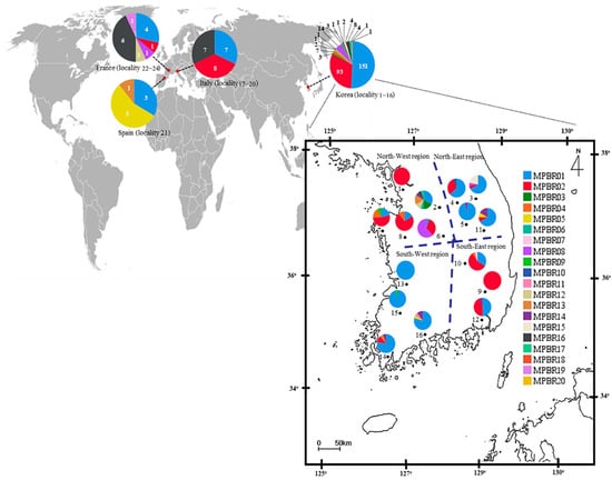 Among the 17 haplotypes found in Korea, MPBR01, MPBR02, and MPBR16 were the most widely distributed in 14, 11, and 6 localities, respectively; others were found in 1–3 localities (Figure 3; Table S11). Haplotype abundance was exceptionally high at eight in locality 2 (Yeoju), which is located in the North-West region, compared to that at any of the other localities in Korea and the next highest was four at localities 3, 7, 10, 11, 14, and 16 (Pyeongchang, Taean, Sangju, Yeongju, Haenam, and Suncheon, respectively), presenting a trend that the localities with the higher number of haplotypes are scattered throughout the Korean region (Figure 3; Table S11).