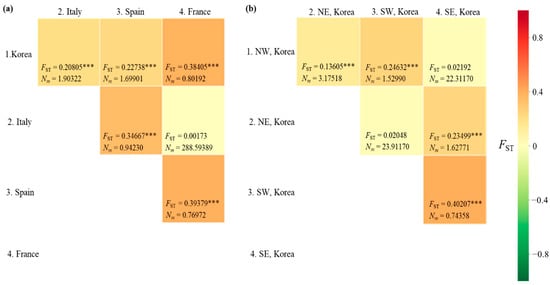 The FST between pairs of countries ranged from 0.00173 (between Italy and France) to 0.39379 (between Spain and France), with a range of Nm from 288.6 (between Italy and France) to 0.770 (between Spain and France) (Figure 4a). A significant genetic differentiation (p < 0.001) was observed in all country pairs, except for the comparisons between Italy and France. When the Korean localities were divided into the four regions, as we did for the diversity analysis, a significant FST (p < 0.001) was detected in four comparisons, but not in the comparisons between the North-East and South-West regions and between the North-West and South-East regions (Figure 4b). Between the North-East and South-West regions, the Nm equaled 23.912. Similarly, in the comparison between the North-West and South-East regions, the Nm equaled to 22.311, indicating a substantial gene flow between pairs across regions. These results indicate a higher gene flow between the regions located diagonally (between North-East and South-West regions and between North-West and South-East regions) than between those located adjacent to each other (between North and South regions).