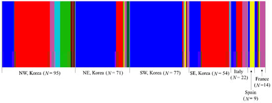BAPS analysis under optimal K = 8 showed that all eight haplogroups were found in Korea, three in Italy, two in Spain, and five in France (Figure 5). In the European countries, one haplogroup (blue), which is one of the two dominant haplogroups in Korea, was found everywhere. Another dominant haplogroup in Korea (red) was found in Italy and France, but not in Spain. The three haplogroups found in Italy were all present in France, but France also had additional haplogroups (green and yellow). These results collectively indicate that all the countries share a certain level of genetic groups, and a certain level of difference exists between the countries (Figure 5). Within Korea, seven haplogroups were found in the North-West region, six in both the North-East and South-West regions, and four in the South-East region, presenting the highest number of haplogroups in the North-West region. Among the regions, the North-West and South-East regions shared one (red) haplogroup to a great extent with each other, whereas the North-East and South-West regions shared another haplogroup extensively (blue), indicating a certain level of similarity between the North-West and South-East regions and between the North-East and South-West regions.