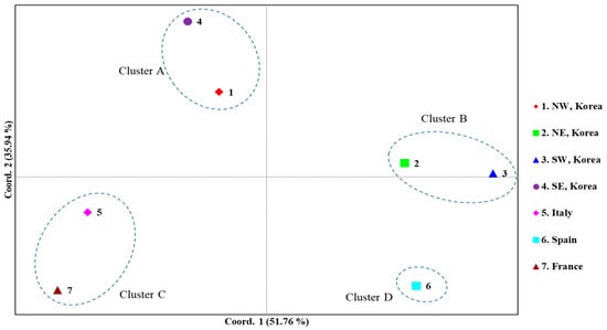 A PCoA among the countries, dividing the Korean localities into four regional groups, was performed to further examine population relationships (Figure 6). The first and second components accounted for 51.76% and 35.94% of the variation, respectively. Overall, four clusters were detected: Cluster A, comprising the Korean North-West and South-East regions; Cluster B, comprising the Korean North-East and South-West regions; Cluster C, comprising Italy and France; and Cluster D, comprising solely Spain. These results are largely consistent with the FST estimates (Figure 4) and BAPS analysis (Figure 5) and suggest a certain level of similarity between the North-West and South-East regions and between the North-East and South-West regions in Korea.