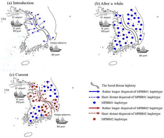 Scenarios of potential points of entry and expansion routes of Metcalfa pruinosa in Korea. (a) The initial introduction of M. pruinosa possessing one dominant haplotype (MPBR01) through port(s) and/or the airport located in the North-West region and Busan port located in the South-East region, and subsequent expansion primarily through the Seoul−Busan highway. (b) Eventual widespread distribution of MPBR01 occurs over all of Korea. (c) Introduction of M. pruinosa possessing another dominant haplotype (MPBR02) through port(s) and/or the airport located in the North-West region and widespread primarily in the North-West and South−East regions, but not yet to other locations. Incheon (IC), Pyeongtaek−Dangjin (PD), and Busan (BS).