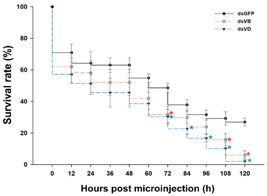 L. trifolii adults were injected with dsV-ATPase B, dsV-ATPase D, or dsGFP (control), and mortality was assessed at 12 h intervals for five days. In general, adults injected with dsV-ATPase B and dsV-ATPase D had similar survival rates throughout the experiment (120 h) (Figure 5). Significant reductions in survival relative to that of the control were first observed for dsV-ATPase B and dsV-ATPase D at 72 h after injection (V-ATPase B: t = 2.806, p < 0.05; V-ATPase D: t = 3.364, p < 0.05). Survival in the dsV-ATPase D treatment group continued to decline significantly at 84, 96, 108, and 120 h after injection (84 h: t = 3.180, p < 0.05; 96 h: t = 3.934, p < 0.05; 108 h: t = 3.362, p < 0.05; 120 h: t = 7.534, p < 0.05). In addition to the 72 h interval, survival in the dsV-ATPase B treatment group was also significantly lower at 108 and 120 h after injection (108 h: t = 2.382, p < 0.05; 120 h: t = 5.630, p < 0.05). At five days (120 h) after injection, only 6.02% and 2.08% of adults survived injection with dsV-ATPase B and V-ATPase D, respectively, compared to 26.98% with dsGFP (Figure 5).