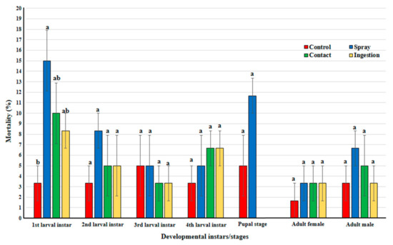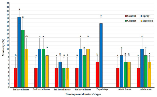 Percent mortality of larva, pupa, and adults of Coccinella undecimpunctata treated with three different applications with Beauveria bassiana. Different letters above bars indicate significantly different means according to Duncan test (α = 5%) except of pupal stage with t-test (α = 5%).