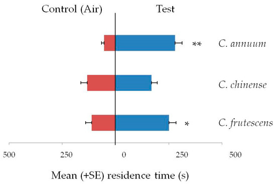 Olfactory response of Lasioderma serricorne to volatiles of dried fruit powder of three Capsicum species, C. annuum, C. chinense and C. frutescens, in Y-tube olfactometer. Bars indicate the mean residence time (+SE) adult beetles spent in the arm with the odor source. Thirty insects tested per treatment. T-test for dependent samples, * p < 0.05 ** p < 0.01.