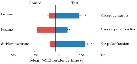 Olfactory response of Lasioderma serricorne adults to C. annuum (CA) extracts and fractions thereof in a Y-tube olfactometer. Bars indicate the mean residence time (+ SE) adult beetles spent in the arm with the odor source. Thirty insects tested per treatment, T-test for dependent samples, * p < 0.01.