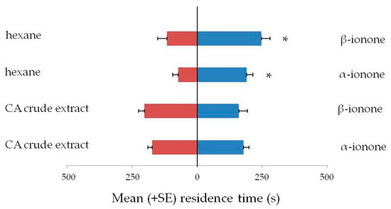 Olfactory response of Lasioderma serricorne adults to α-ionone and β-ionone versus solvent or C. annuum extract in Y-tube olfactometer. Bars indicate the mean residence time (+SE) adult beetles spent in the arm with the odor source. Thirty insects tested per treatment, t-test for dependent samples, * p ≤ 0.01.