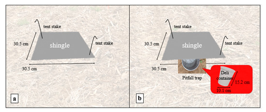 The traditional trap consisted of a 30.5 cm × 30.5 cm Shasta white roofing shingle (Owens Corning®, Toledo, OH, USA), after Douglas and Tooker [3]. Shingles were placed directly over residue and secured with two galvanized tent stakes in opposing corners (ALAZCO™, Stilwell, KS, USA) (Figure 1a). The modified trap consisted of a 30.5 cm × 30.5 cm Shasta white shingle with a pitfall trap underneath. The pitfall was a 0.95 L white deli container filled ½ way with water to which a drop of dish detergent had been added (to reduce surface tension). The pitfall trap was emptied and refilled with soapy water weekly. The container was placed in a hole made by a golf hole cup cutter so the rim was flush with the soil surface (Figure 1b). The shingle was placed over the pitfall and secured as described above. The traditional and modified refuge traps were deployed as pairs, set 1 m apart from each another in each plot (Figure 2).