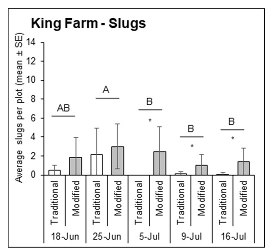 Average number of slugs sampled from each traditional trap (white bars) and modified trap (gray bars) for each sampling date in 2018 at King Farm in Wooster, OH, USA. Uppercase letters represent significant differences (p < 0.05) from multiple comparisons analyses comparing total slugs per plot over time. Asterisks above bars indicate significant differences (p < 0.05) in the number of slugs caught by the traditional and modified traps for that sampling date.