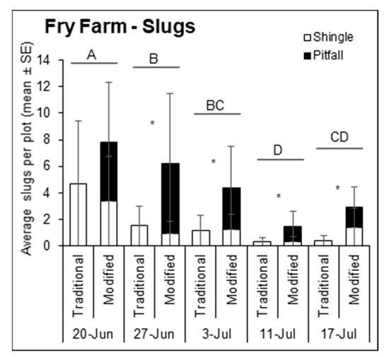 Average number of slugs sampled from under the traditional (left bar) and modified (right bar) traps for each sampling date in 2019 at Fry Farm in Wooster, OH, USA. Data from the modified trap are broken down into components (shingle, white vs. pitfall, black). Uppercase letters represent significant differences (p < 0.05) from multiple comparisons analyses comparing total slugs per plot over time. Asterisks indicate significant differences (p < 0.05) in the number of slugs caught by the traditional and modified traps for that sampling date.