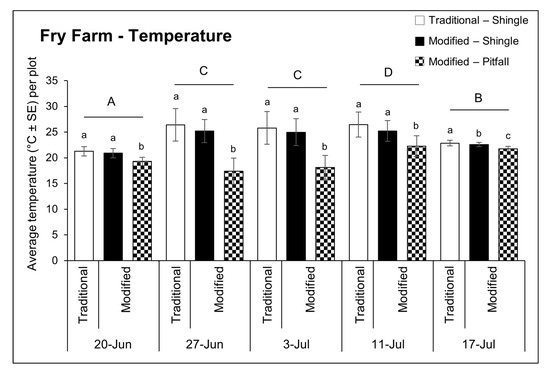 The average temperature recorded under each trap type (F = 17.99, df = 4, 320, p < 0.0001) and component (F = 36.67, df = 4, 320, p < 0.0001) significantly varied over time (Figure 5). Average trap temperatures were significantly warmer on 11 July (24.5 ± 2.8 °C) than any other sampling date and the fewest slugs per trap were recorded at this time (F = 53.42, df = 4, 320, p < 0.0001). There was a significant relationship between trap type and temperature (F = 208.37, df = 1, 320, p < 0.0001); modified traps (21.7 ± 3.3 °C) were approximately 3 °C cooler on average than traditional traps (24.6 ± 3.1 °C). Temperature also differed under each trap component (F = 322.80, df = 1, 320, p < 0.0001). The pitfall portion of the modified traps was on average cooler (19.7 ± 2.7 °C) than the temperature under the shingle component of the modified trap (23.8 ± 2.5 °C) (t = −17.97, df = 320, p < 0.0001) or under the traditional shingle trap (24.6 ± 3.1 °C) (t = −21.48, df = 320, p < 0.0001)—a pattern which did not vary by sampling date. Temperature under modified trap and traditional trap shingles was similar on all sampling dates except for 17 July (t = −2.63, df = 45, p = 0.0309).