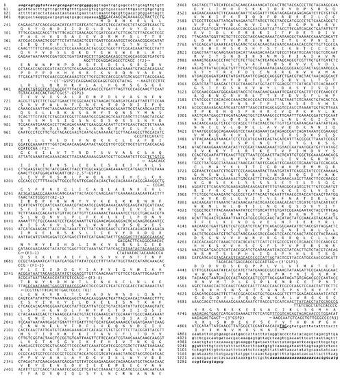 Sequence of Sl-apaf-1 cDNA and predicted amino acids. The complete cDNA consists of 5221 bp and contains an open reading frame of 4626 bp that encodes 1542 amino acids. The start codon and stop codons are underlined.