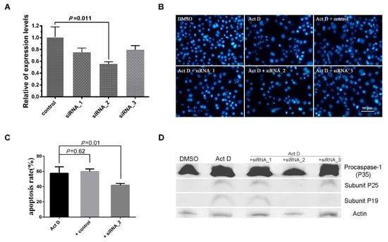 To determine the function of Sl-Apaf-1, three siRNA were designed and synthesized (Table 2). SL-1 cells were transfected with the siRNA and control siRNA. The expression levels of Sl-apaf-1 decreased 26.7%, 44.3%, and 20.3% against the control after treatment for 48 h, and siRNA-2-treated cells had the lowest expression level (Figure 3A). Then, the cells were treated with Act D at a final concentration of 500 ng/mL for a further 6 h. DAPI staining showed that the numbers of nuclear body fragments (a phenotype of apoptosis) in the siRNA-2 treatment group and the untreated group (DMSO) were significantly lower than in other groups (Figure 3B). Next, the apoptosis percentage of SL-1 cell treated by Act D at 500 ng/mL for 4 h were measured. The apoptotic rate of the siRNA-2-treatment group was significantly lower than that of the untreated group (p = 0.011, Figure 3C). Furthermore, the activities of Sl-caspase-1 were also detected by rabbit anti-Sf-caspase-1 antiserum. Cleavage of Sl-caspase-1 protein in Act D + siRNA-2-treated cells was undetectable. However, in the Act D, Act D + siRNA1, and Act D + siRNA3 treatment groups, the Sl-caspase-1 P19 subunit and/or the P25 subunit could be detected (Figure 3D). These assays showed that siRNA-2 effectively interfered with Sl-apaf-1 expression, and the decrease of Sl-apaf-1 expression protected SL-1 cells from Act-D-induced apoptosis.