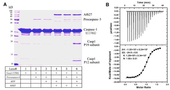 The reaction was conducted at 28 °C for 30 min with 10 nmol dATP, 0.5 μg purified Sl-proaspase-5, 2 μg purified Af627, and 10 ug purified Sl-procaspase-1 (C178A) protein in the reaction buffer (100 mM KCl, 20 mM HEPES, 5 mM DTT, at pH 7.5) [12]. The reaction was stopped by adding 5× SDS-loading buffer and the mixture was boiled at 100 °C for 5 min. The reaction products were subjected to 12% SDS-PAGE. The results were visualized by Coomassie blue staining.