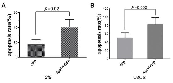 To determine the functional conservatism of Sl-Apaf-1, Sl-Apaf-1 was over-expressed in Lepidopteran cells (Sf9) and mammalian cells (U2OS). FACS assay of transfected cells was performed after treatment with 500 ng/mL Act D for 4 h. The results showed that overexpression of Sl-Apaf-1 significantly promoted apoptosis in both cells. For both, the apoptosis rate was promoted by over 20% (22.02% for Sf9 cells and 32.33% for U2OS cells) when compared with EGFP-overexpressing cells (Figure 6A,B).